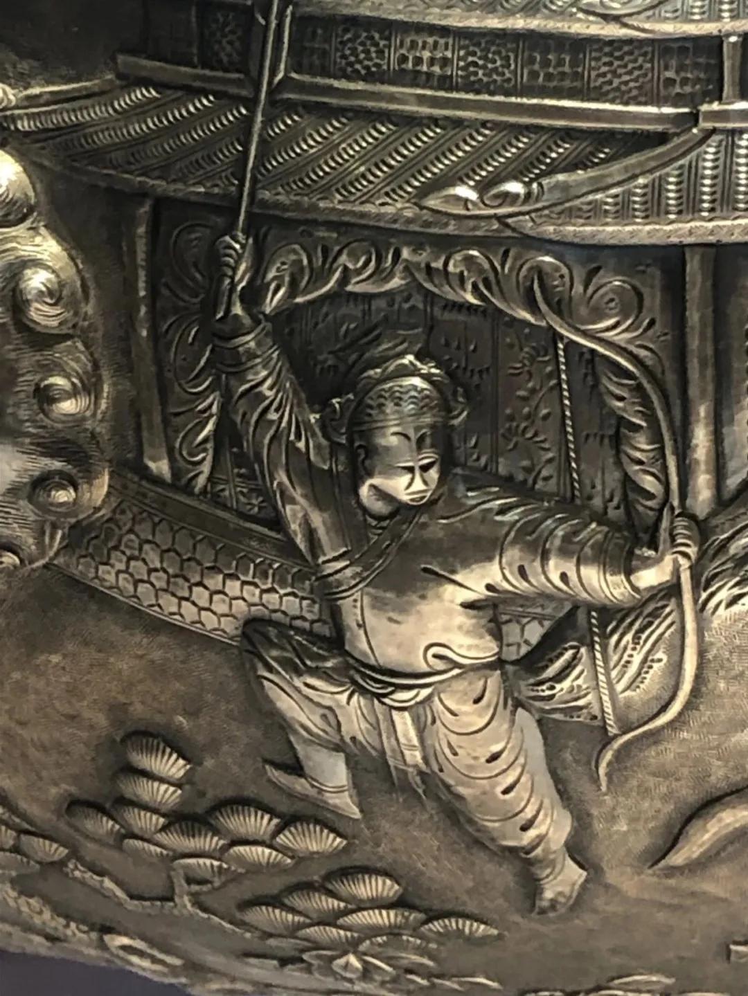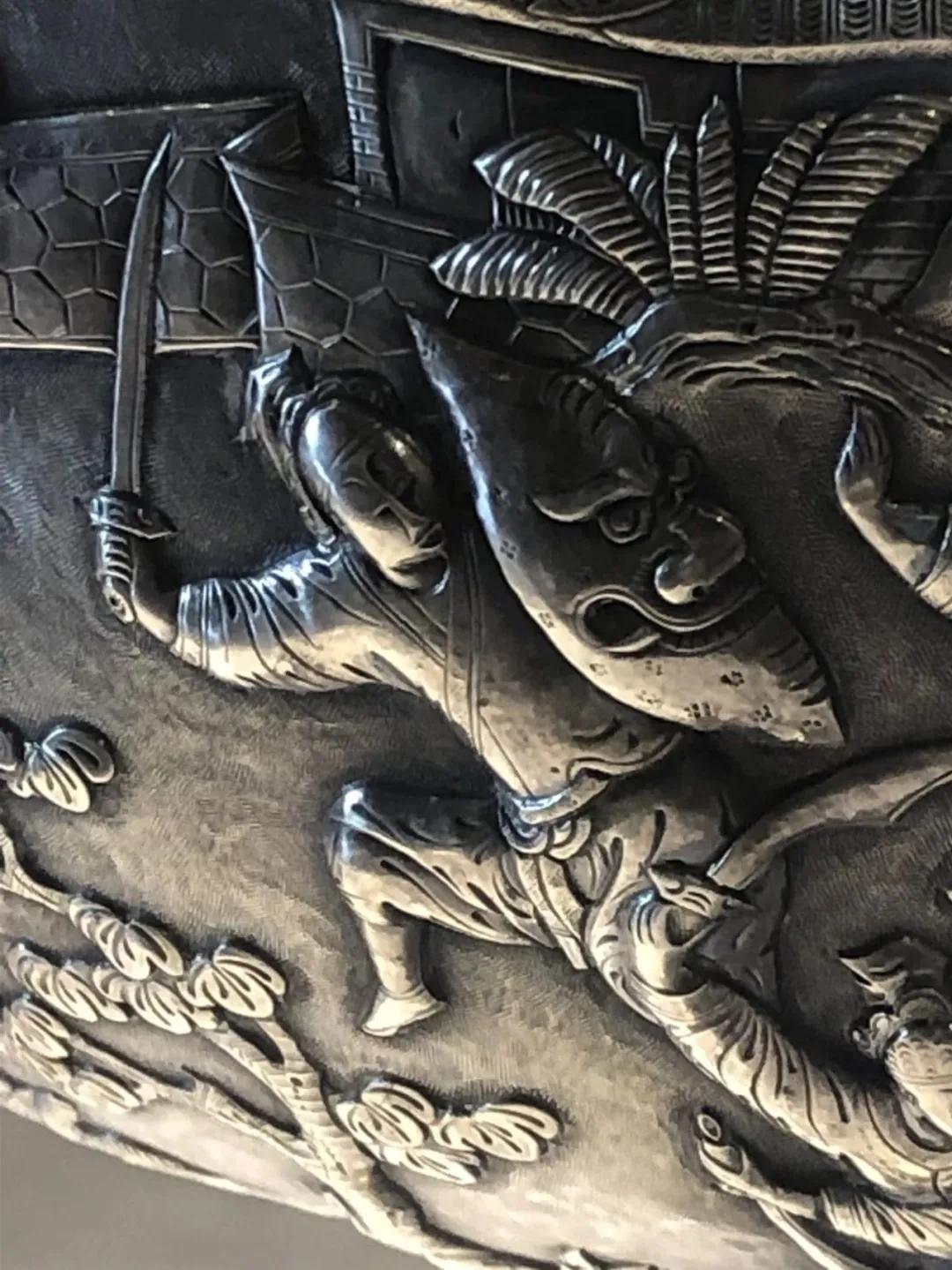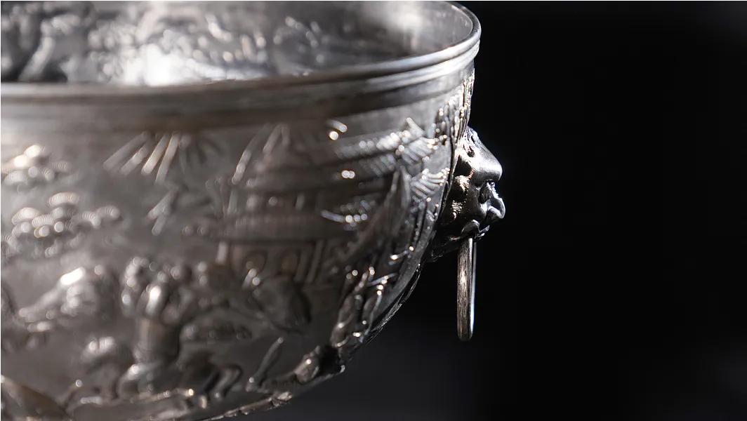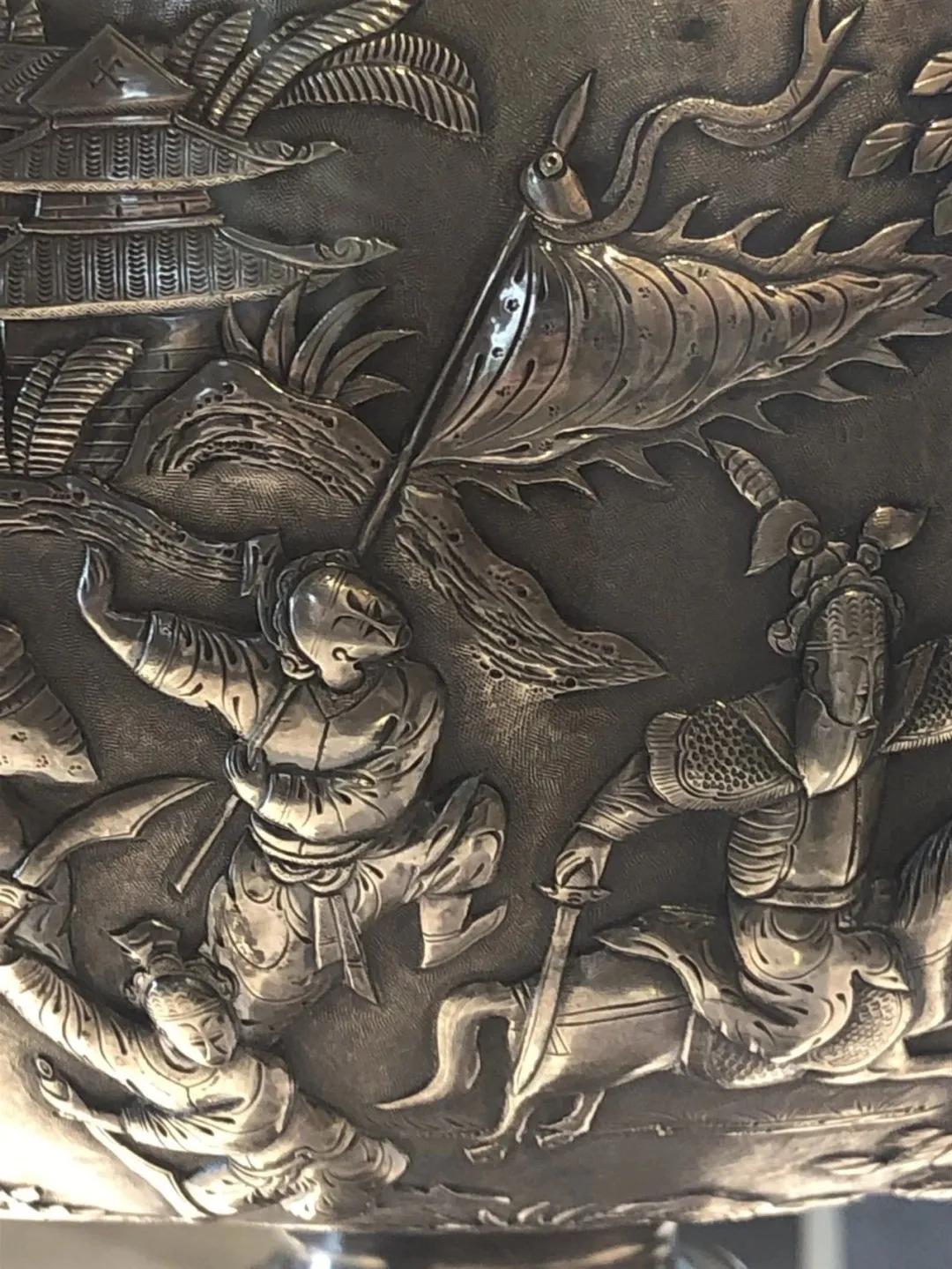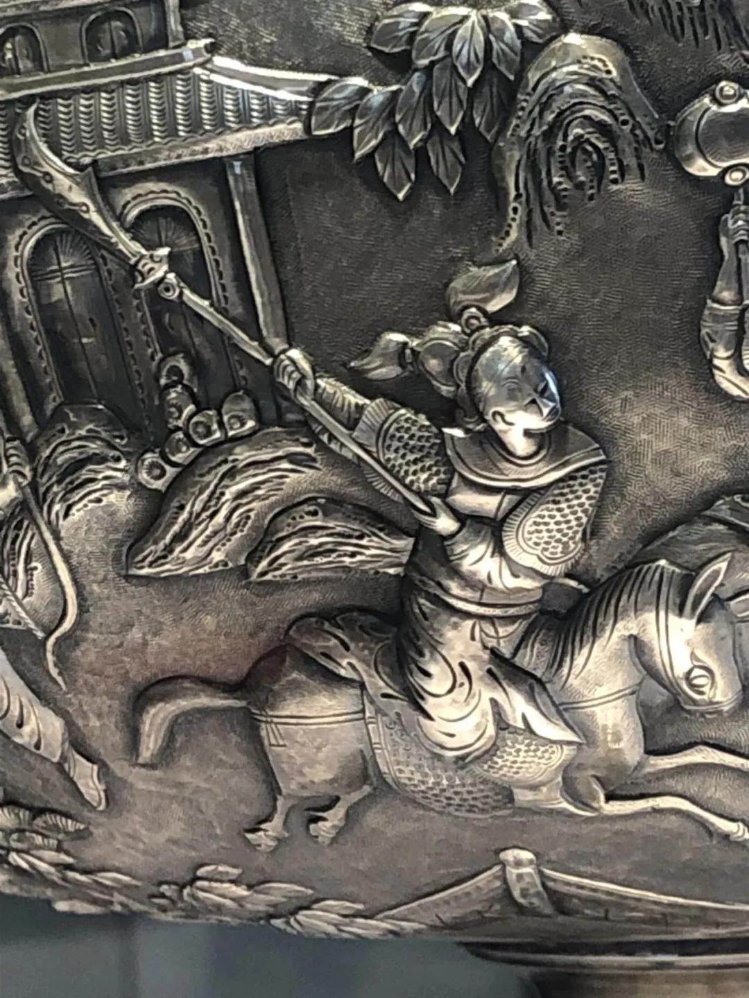 文物赏析广东大观博物馆藏 刀马人物银质奖杯 清代 ![]() 文物介绍这个银杯是清代广州十三行时期的典型外销银器,整体纹饰华丽,雍容大气,武将图、花卉纹以及雕龙柱等图形提炼出中国的历史文化元素,成为吸引西洋人的浓重看点。 ![]() 从结构来看 这个银杯由三部分组成 最上方是一个敞口巨碗。碗壁的两侧,置有衔环兽耳。碗身外壁则雕饰有武将人物图,描绘两军交战的画面,出场的武将共有15个之多,可谓气势恢弘、体制巨大。仔细观察,可以发现这15个武将当中,既有步兵,也有骑兵。他们的动作各有不同,所执武器也呈现出多种多样的状态。既有执剑的,也有持枪的,有挥舞关刀的,也有手持弓箭的,还有双手挥舞着大锤的,以及手持兽面盾牌的。双方都各有一人负责把持军旗。在交战场面以外,还雕刻有楼宇建筑、树木山石等图案,起到了点缀装饰的作用。这种武将图,在清代的外销银器纹饰当中,十分普遍,是一个常见的类型。 {武将人物纹饰的局部放大图}![]() 持大锤者 ![]() 持盾者 ![]() 持弓箭者 ![]() 持关刀者 ![]() 持剑者 ![]() 持军旗者 银杯的中间部分,则是连接巨碗与底座的支柱。支柱由三条雕刻的巨龙构成。这三条龙皆怒目张嘴,角鳍飞扬,气势威严。龙柱的头部和尾部各被饰有花卉纹的环状银圈所镶连,完美地衔接了上下结构。 ![]() 龙柱 银杯最下面的一部分是底座,底座上饰有繁复华丽的花卉纹。 应当说,从观赏角度而言,这个清代的刀马人物银质奖杯具备着卓越的艺术价值,是用中国的金属冶炼工艺讲好中国故事的典型例子。 |